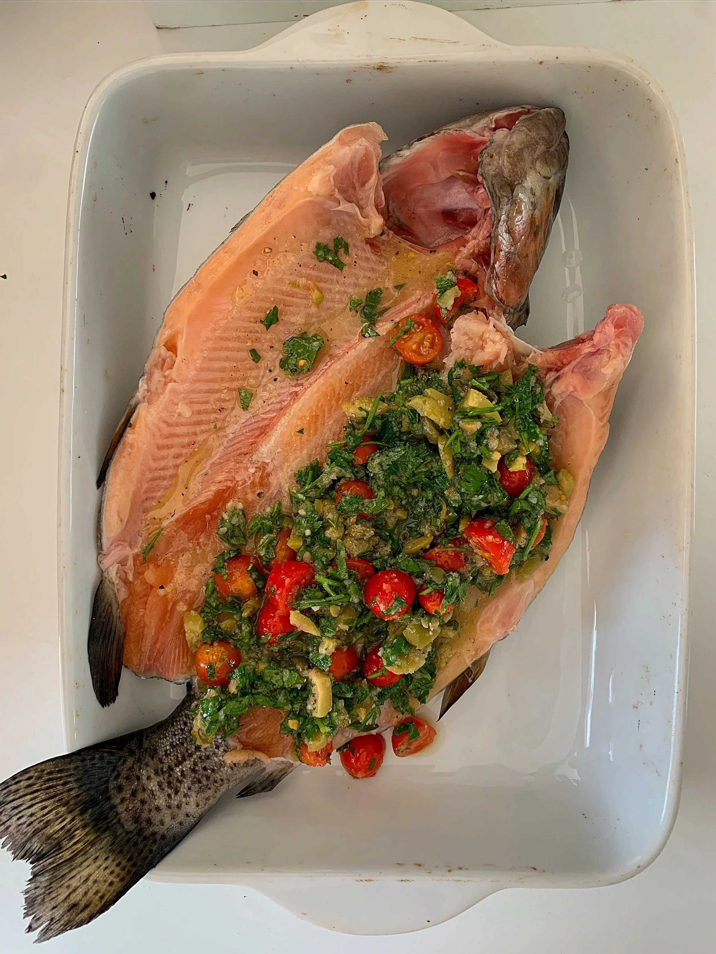 Place the fish into a baking dish. Drizzle the remaining olive oil over the outside of the fish and season well with salt and pepper.