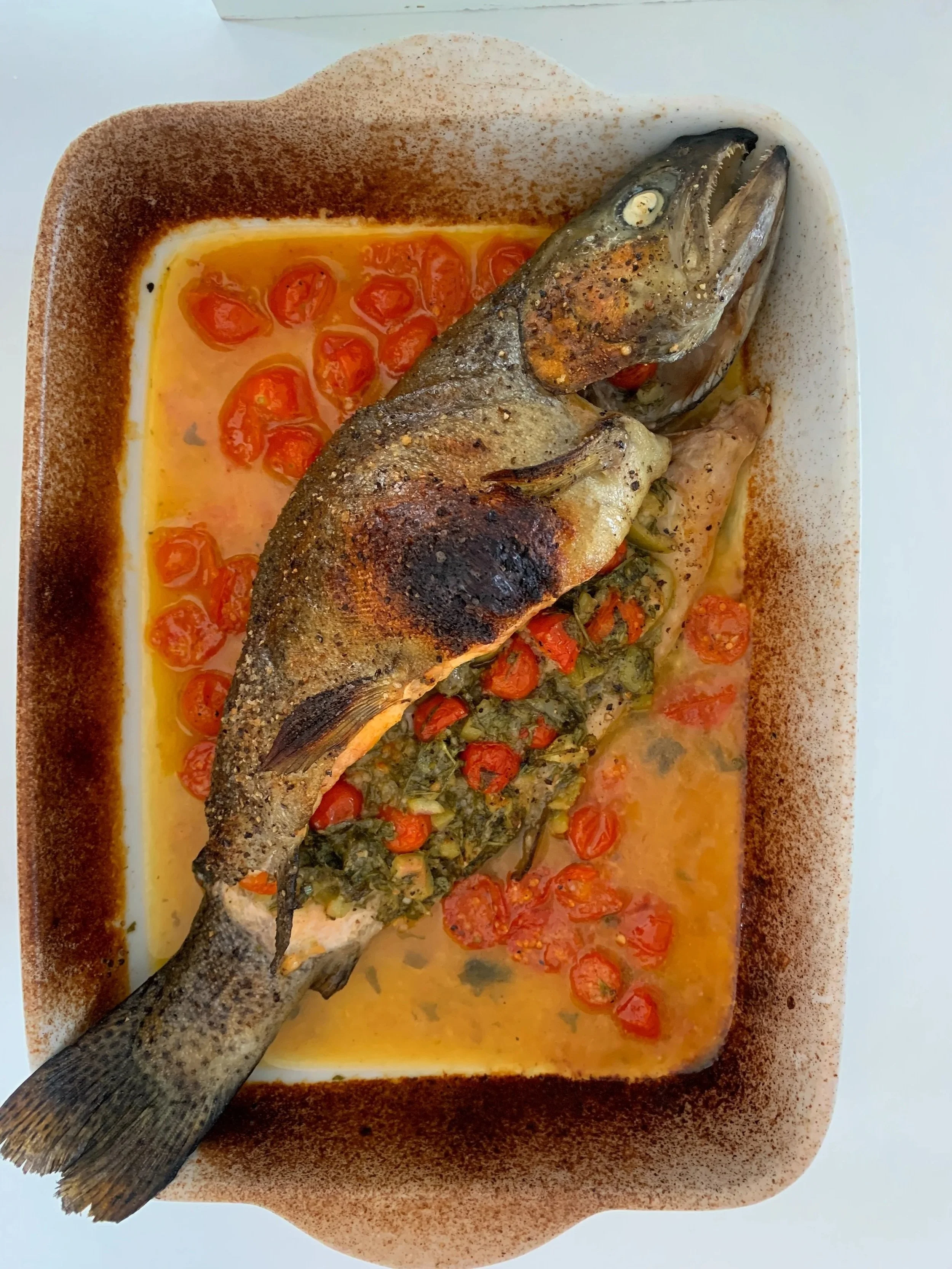 Where olives, capers, herbs and lemon infuse the fish from the inside as it bakes.