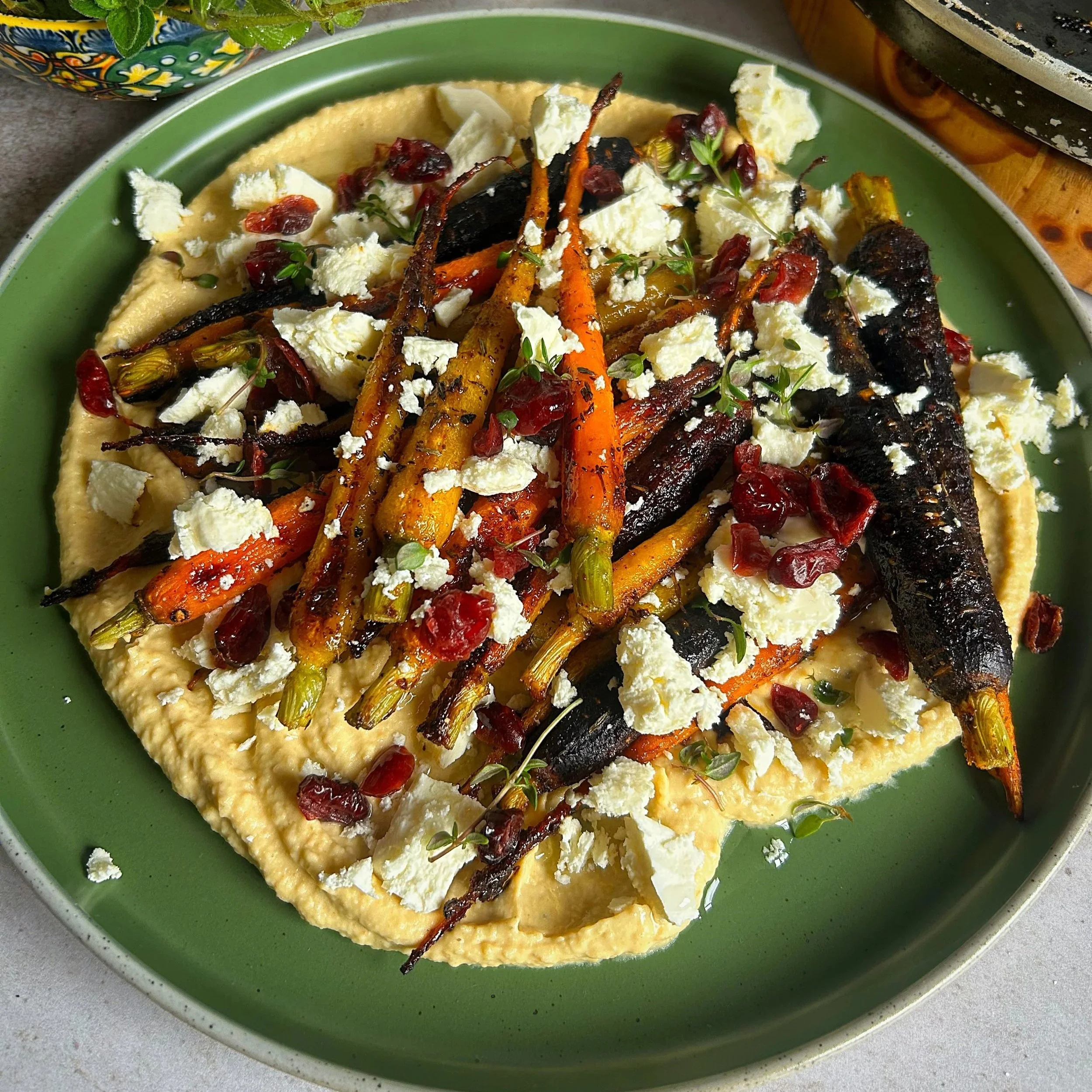 Sweet, caramelised carrots layered over creamy hummus, finished with feta and bursts of sweetness.