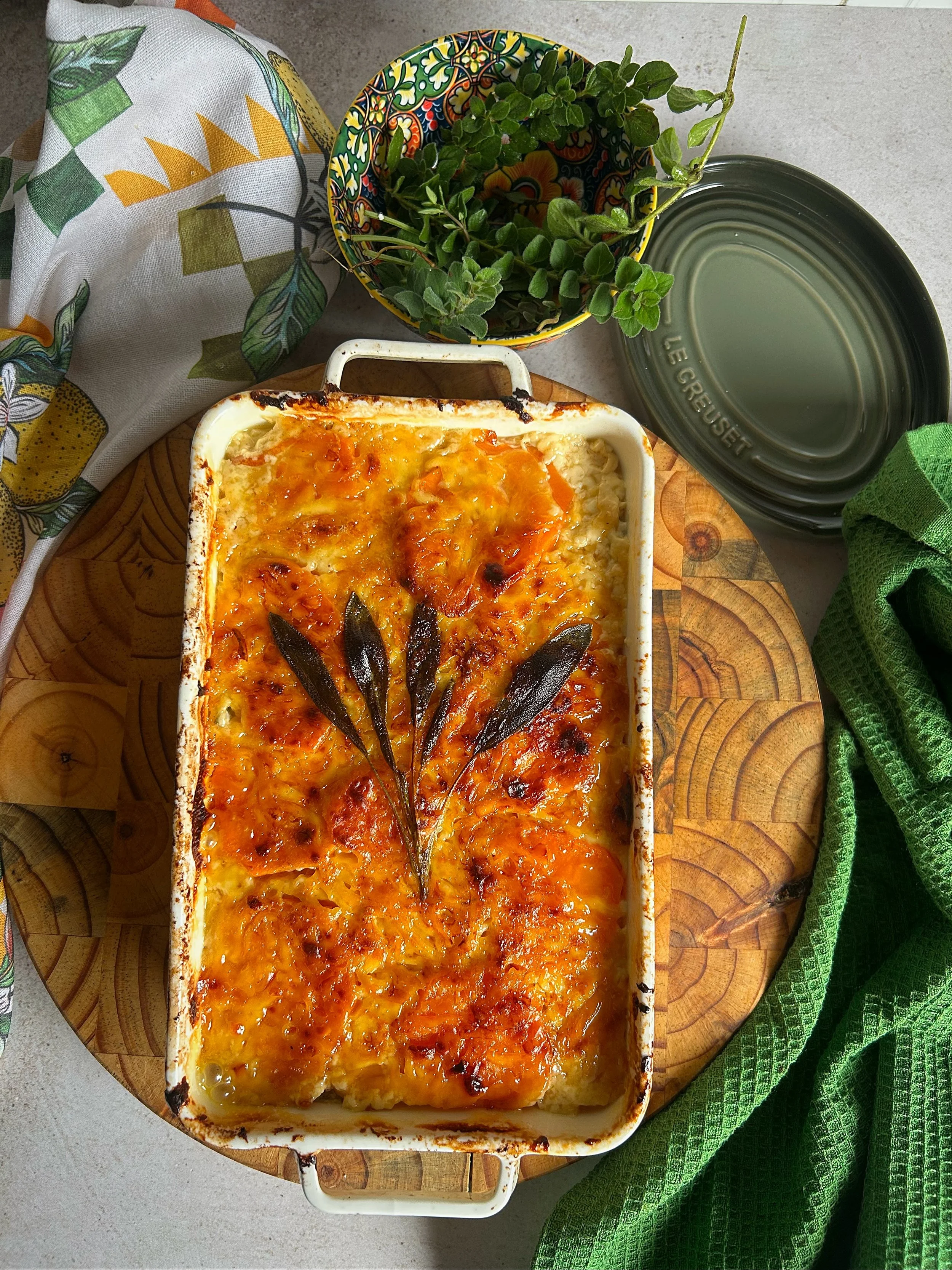 Layers of thinly sliced sweet potato baked slowly with cream, herbs and cheese until soft, rich and golden on top. It’s simple in its ingredients, but the result feels generous and full of depth.