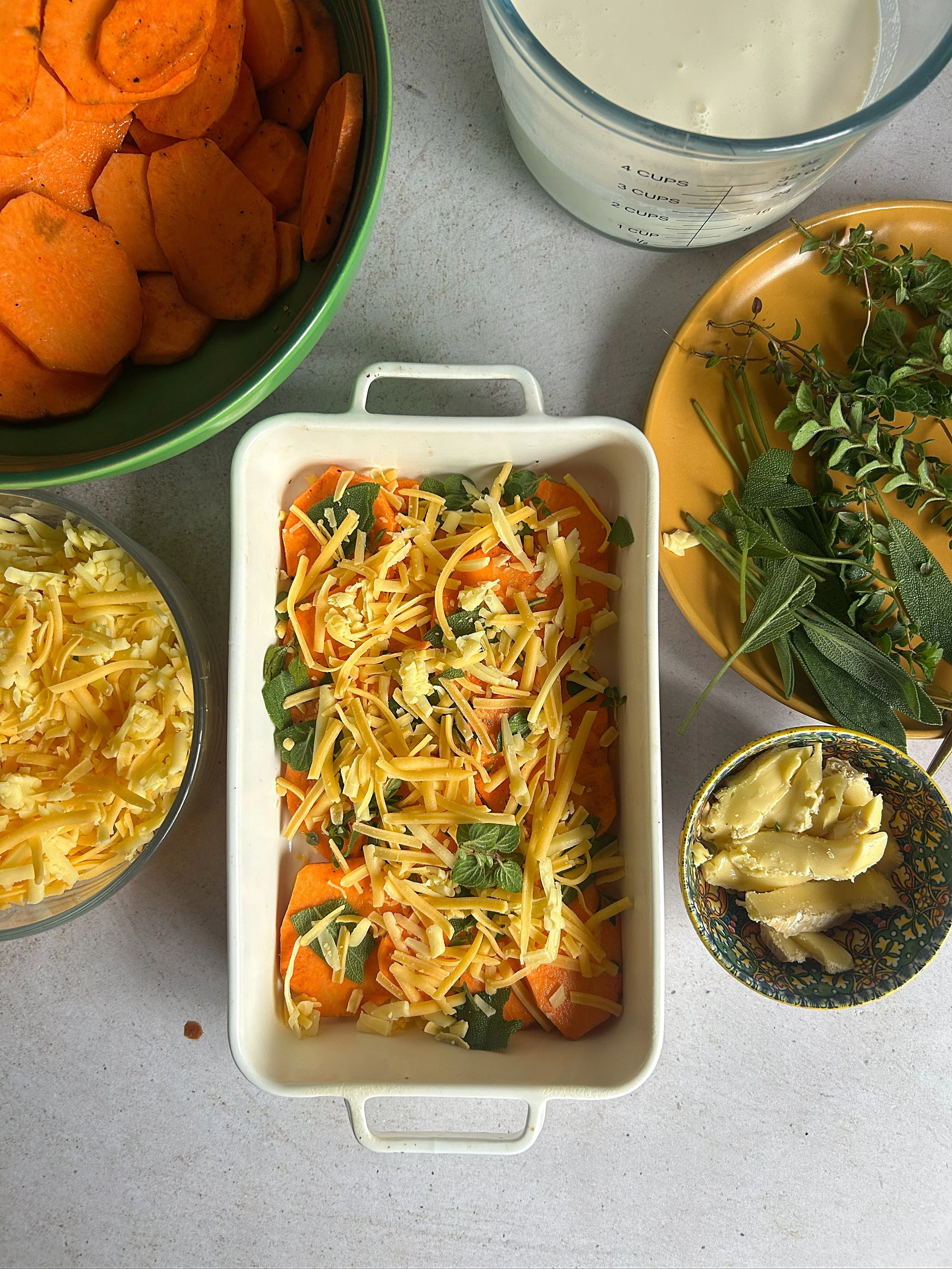 Begin layering the gratin: arrange a layer of sweet potato, followed by a scattering of cheddar and fresh herbs. Repeat the layers until the dish is filled.
